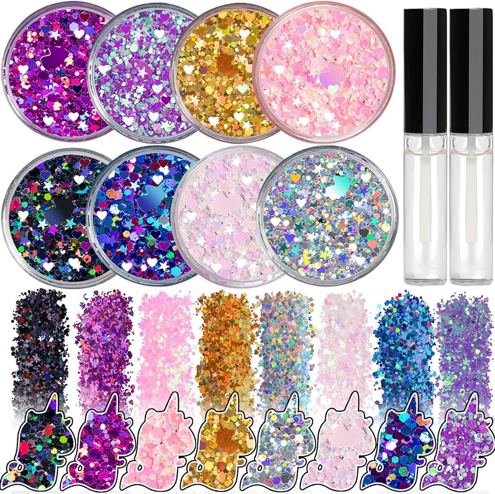 _ 8 COLORS OF COSMETIC CHUNKY GLITTER: Magic Purple Holo; Silver Holo; Pink Holo; Purplish Red Holo; Light Pink&White Holo; Black Holo; Gold Holo; Purplish Blue Holo. Muti-colored options for your Party makeup DIY Deco Design. _ 7 SIZES&SHAPES: All the fancy shapes you could imagine, its included.8 boxes sizes are mixed which is perfect for body& Face& Hair makeup & nail art decoration. _ DIFFERENT STYLING APPLICATIONS: Our cosmetic glitters are extremely versatile and multi-use. Pop some under the eye as glam glitter tears, or on the cheekbones for a reflecting highlight. In the hair we love it mixed in with braids or painted into a middle parting. On the body, dust some on the collarbones and shoulders for a super shimmering effect. _ GREAT AMOUNT+FREE QUICK DRY GLUE: You will receive 8 pots with 8g/0.28oz of cosmetic glitter in each color, quite enough for multiple times deco, also, free 10ml quick-dry glitter glue gel is included.
