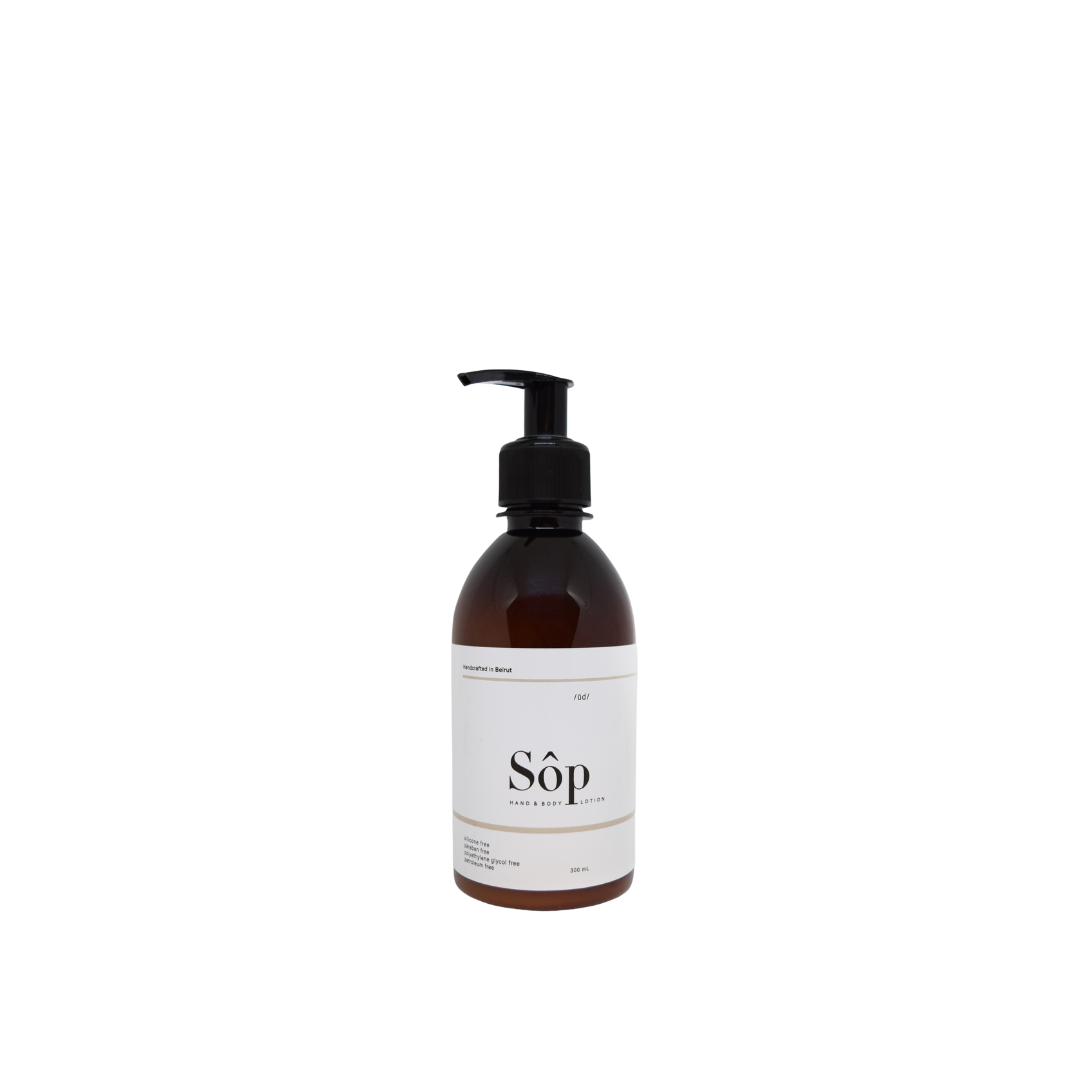 Sôp natural hand & body lotion, a lightweight formula, made with rosehip oil, shea and cocoa butters that deliver long-lasting hydration with no stickiness. It replenishes the skin's natural moisture, maintaining a youthful-looking skin and protecting it against dryness, leaving it pleasantly scented.