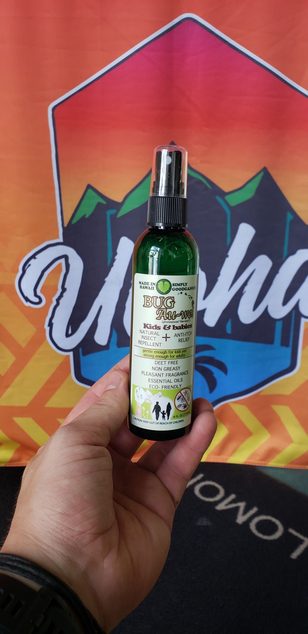 All natural bug repellant made right here in Hawaii! DEET free, made with citronella and aloe vera, and infused with essential oils of witch hazel, lemongrass, apricot oil, and tea tree. Eco friendly with no added colorants, repels mosquitoes, ants, ticks, flies, spiders & sandflies.