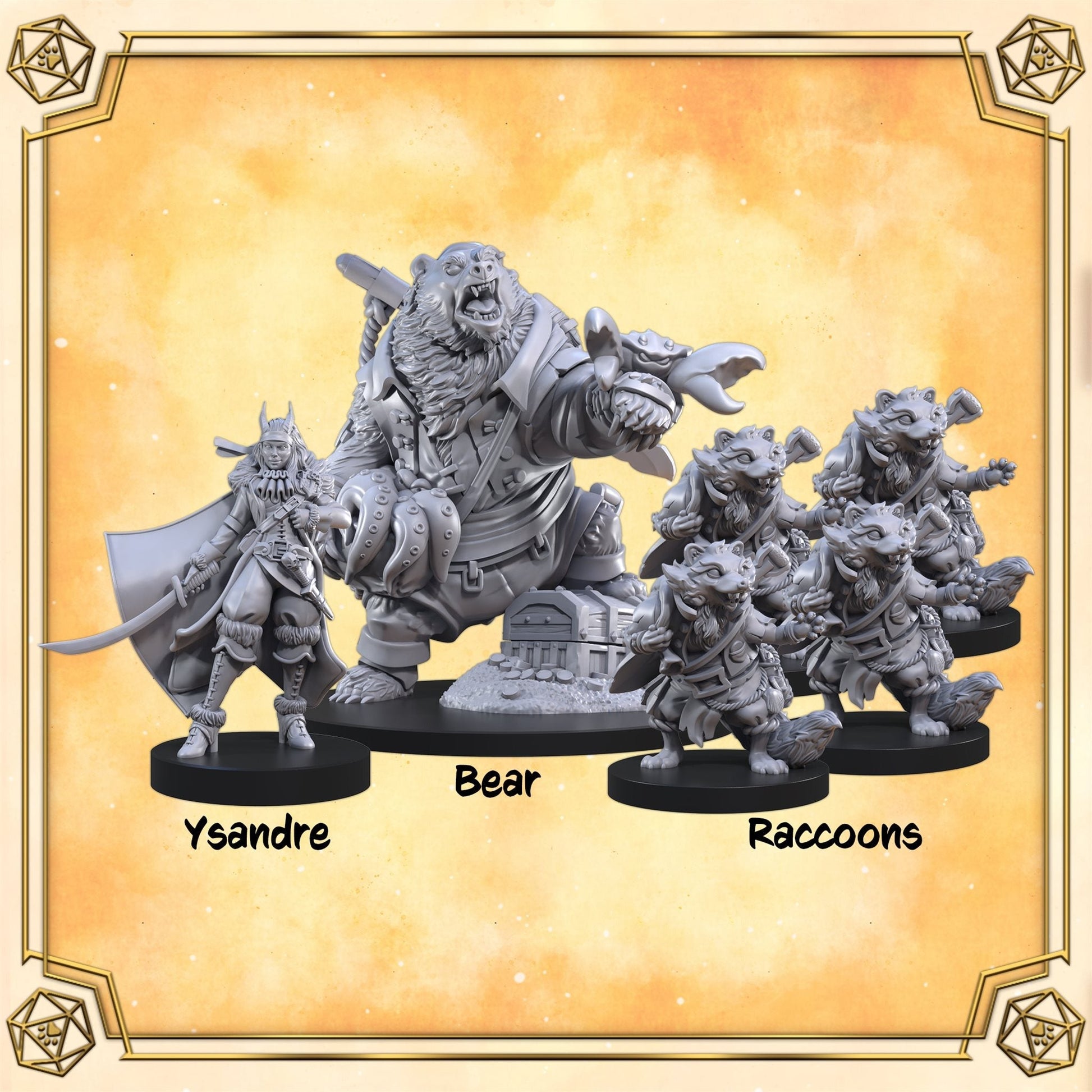 Enlist a ragtag crew of pirates for your next roleplaying game! The Pirate Queen, Ysandre, captains a ship of misfits that’s often spotted in the Faraway Sea. Along with her first mate, Charlamagne the bear, and raccoon crewmates, she scours the high seas for coveted magical items, helping any animals in need along the way.
