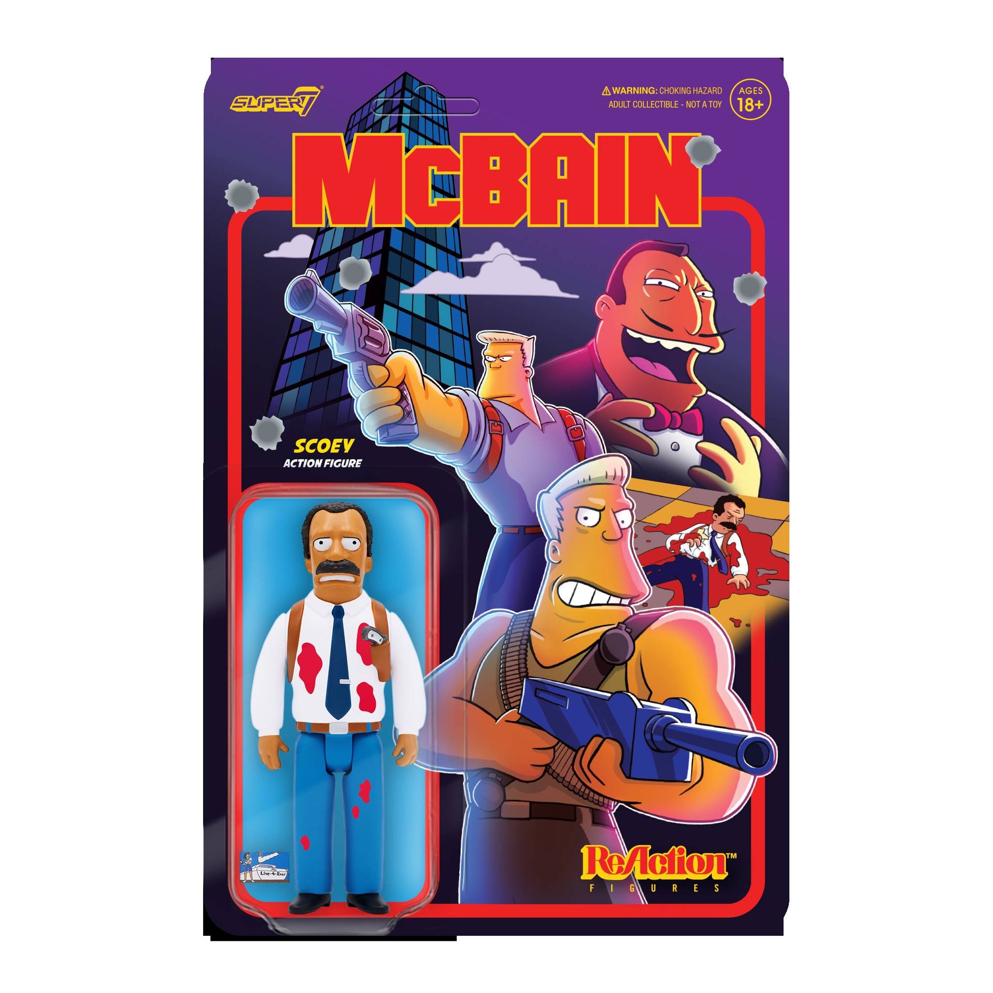 As seen in The Simpsons, relive classic moments from the McBain movie franchise, including the tragic scene at Sloppy Joe’s diner and McBain’s near-miss at the villains\' banquet. With Scoey, Mendoza, and two different McBain figures, these ReAction figures really pack a punch!