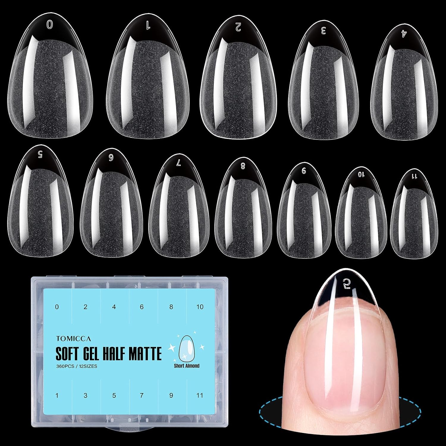 TOMICCA Short Almond Nail Tips, 360Pcs Soft Gel Full Cover False Nails, 12 Sizes Half Matte Pre-shaped Acrylic Nail Tips, Press on Nails tip for Nail Extension, Nail Salon and Home DIY