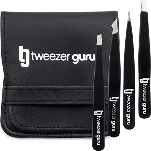 Tweezer Guru Eyebrow Tweezer Set (4-Piece) for Women & Men - Professional Slant and Pointed Tweezers Set with Case - Precision Tweezers Kit for Facial Hair, Splinter and Ingrown Hair Removal